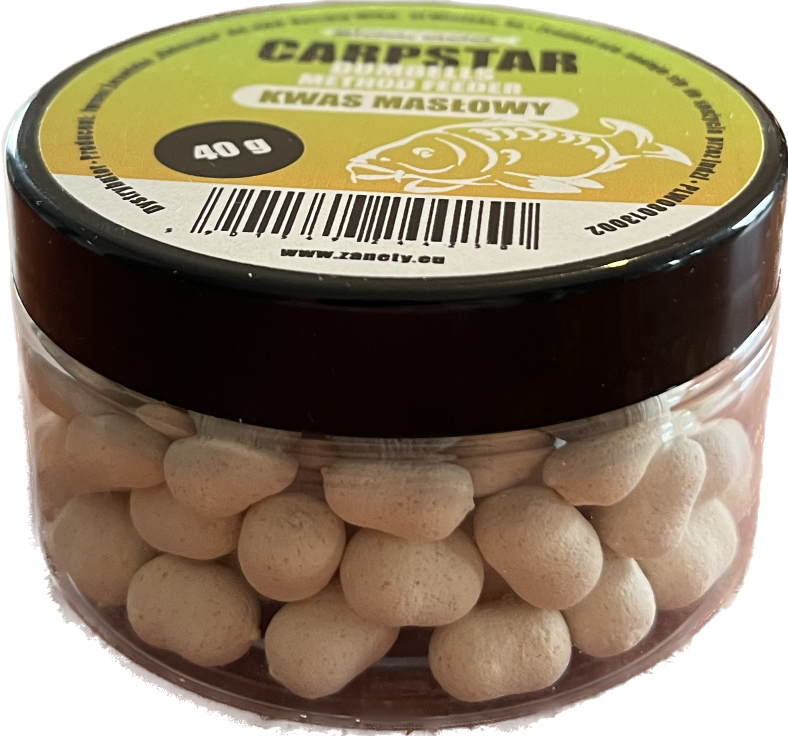 Dumbells to przynęta wykonana z tych samych składników co kulki pływające, intensywne kolory i aromaty doskonale wabią ryby. Idealna przynęta do metody jak i połowów spławikowych.